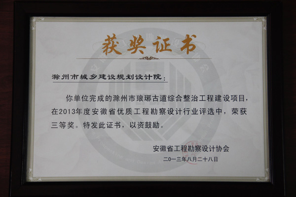 安徽省工程勘察設(shè)計(jì)協(xié)會(huì)于2013年8月3日組織專(zhuān)家召開(kāi)安徽省優(yōu)秀工程勘察設(shè)計(jì)行業(yè)獎(jiǎng)評(píng)審會(huì),對(duì)全省共62家單位上報(bào)的320個(gè)項(xiàng)目進(jìn)行了為期兩天的評(píng)選。由我院市完成的滁州市瑯琊古道綜合整治工程建設(shè)項(xiàng)目在2013年度安徽省優(yōu)秀勘察設(shè)計(jì)行業(yè)評(píng)選中,榮獲三等獎(jiǎng)。